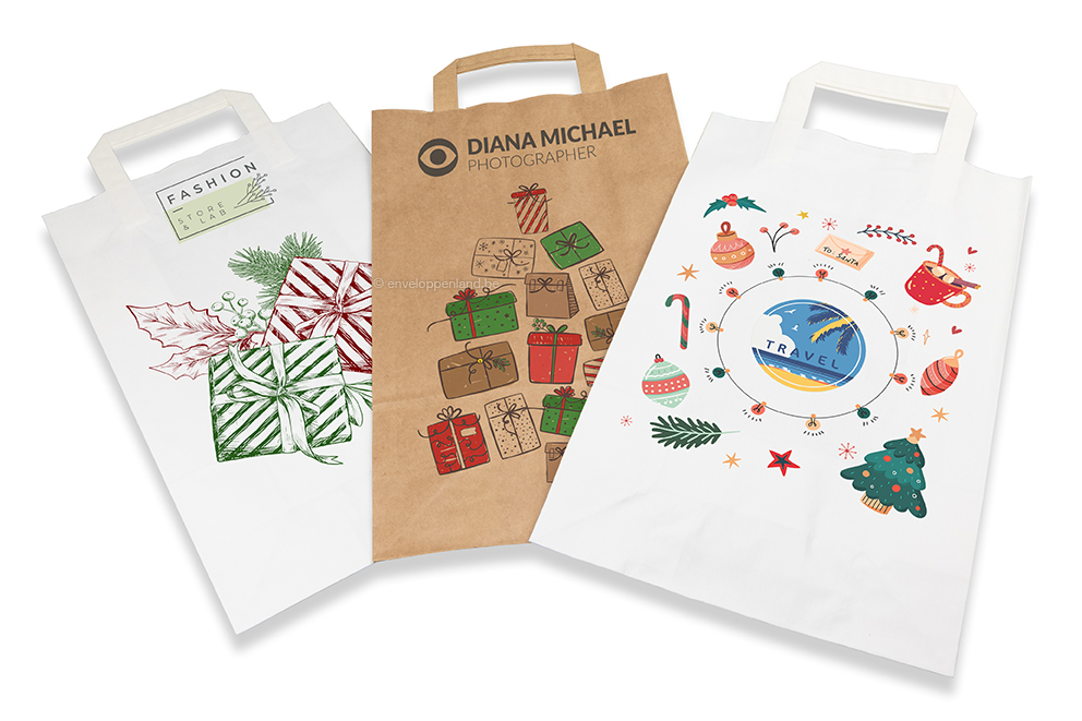 U kunt kiezen uit verschillende feestelijke kerstdesigns in diverse formaten. De tassen hebben een luxe uitstraling en zijn voorzien van platte papieren hengsels voor extra draagcomfort. U kunt ervoor kiezen om uw eigen logo toe te voegen aan het kerstdesign. Op deze manier combineert u een feestelijk ontwerp met een professionele uitstraling, en maakt u van elke tas een persoonlijke, stijlvolle verpakking voor de feestdagen.